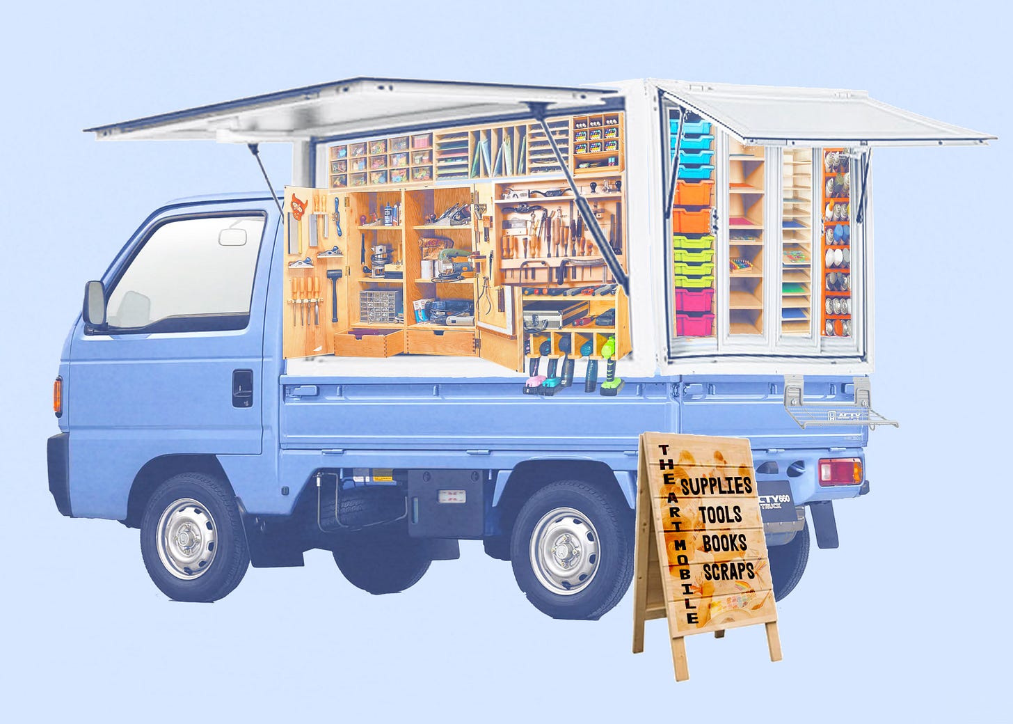The Art Mobile - hosted in a small cute aesthetic truck from Italy or Japan the art mobile is a tiny rural storage space. Filled with an assortment of supplies, tools, and instruction manuals. Paid by a membership fee, or through donations to cover the cost of the truck, gas, and replacing any broken or worn out supplies. The Art Mobile is a library of equipment including tools for linocut, woodworking, sewing, crochet, painting, sculpture, screen-printing, weaving, etc. The Art Mobile is run by volunteers, and parks itself at certain easily accessible locations throughout the week, making special trips for workshops, demonstrations, and classes.