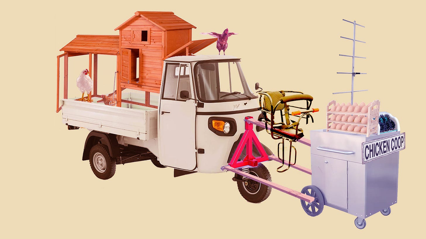 A tag team cargo bike zips along the multipurpose trail. Its one of the Everything Bikes on loan from the Repair Cafe - a collage of old tractor parts, thrown out bus seats, and repurposed sign posts. Pulling a bale of hay in its trailer, the Everything Bike skids right through the open garage doors, HOOTs and BEEPs tumbling out of the megaphone.